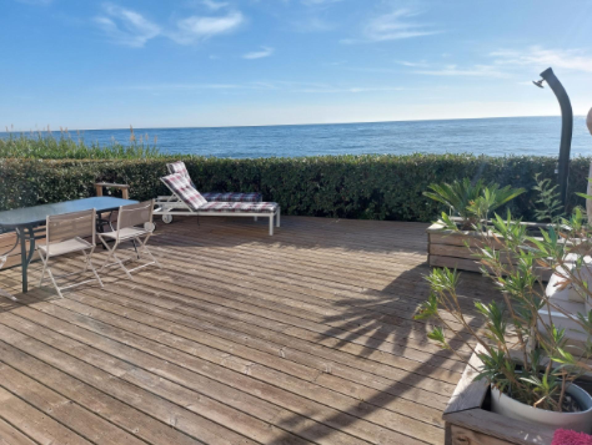 A l'extérieur, vous pourrez apprécier l'agréable terrasse en bois aménagée pour des moments de détente.